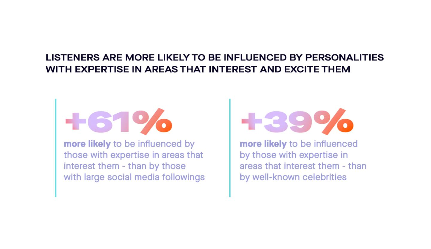 Listeners build relationships with their favorite hosts like Haver, Heath, and Press over hours and weeks of listening. The podcasts become part of their daily routine and help inform their choices. Four in ten female podcast listeners say they’re more likely to be influenced by a knowledgeable host than a celebrity.