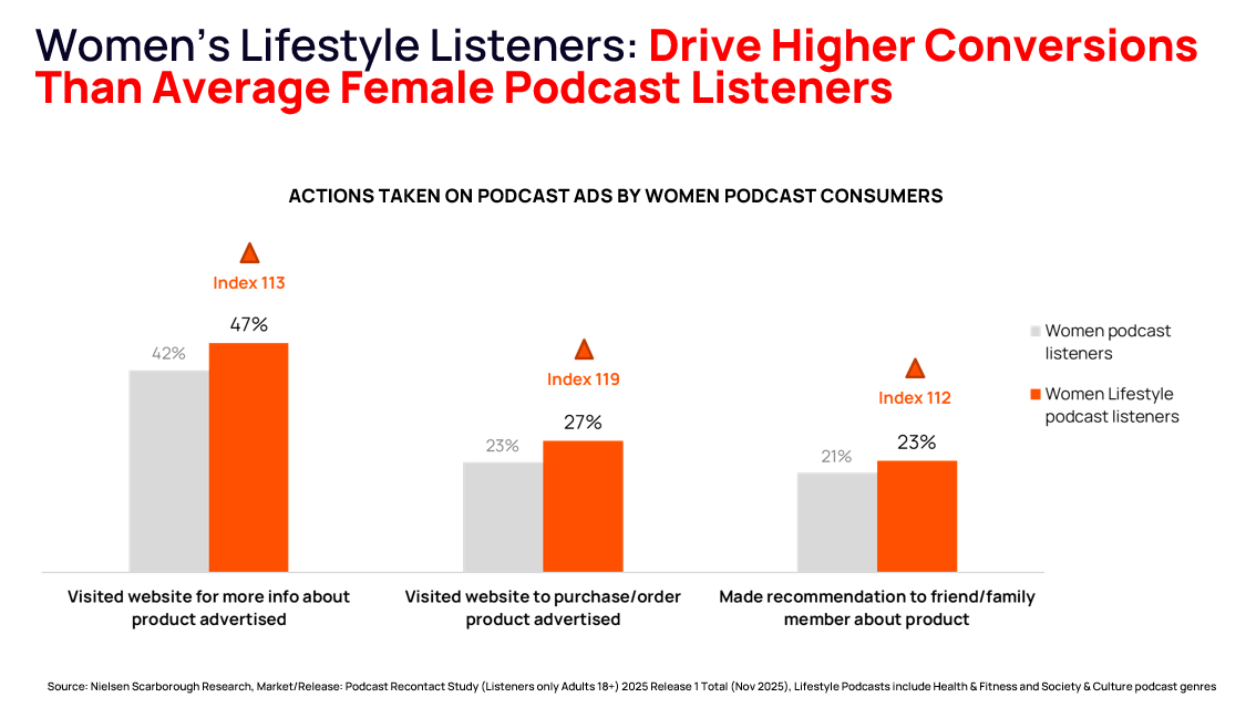 Women’s lifestyle listeners are a fierce and influential audience, with the power to move the needle for brands. In fact, 47% visited a website for more information, 27% made a purchase, and 23% provided recommendations, rates that exceed general female podcast audiences. They’re decision-makers with serious spending power.