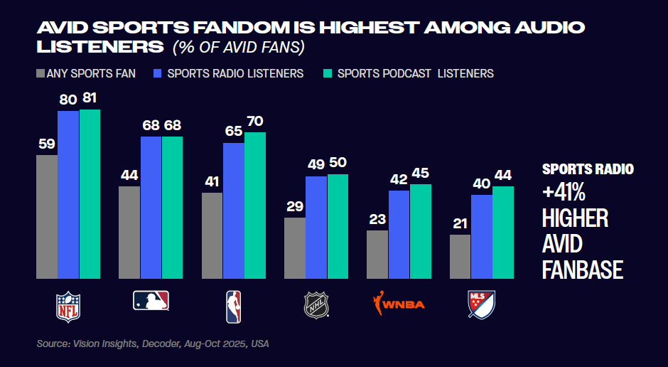 Sports radio and podcasts attract a significantly higher concentration of avid fans. In fact, audio has a 41% higher avid fanbase compared to other platforms.
